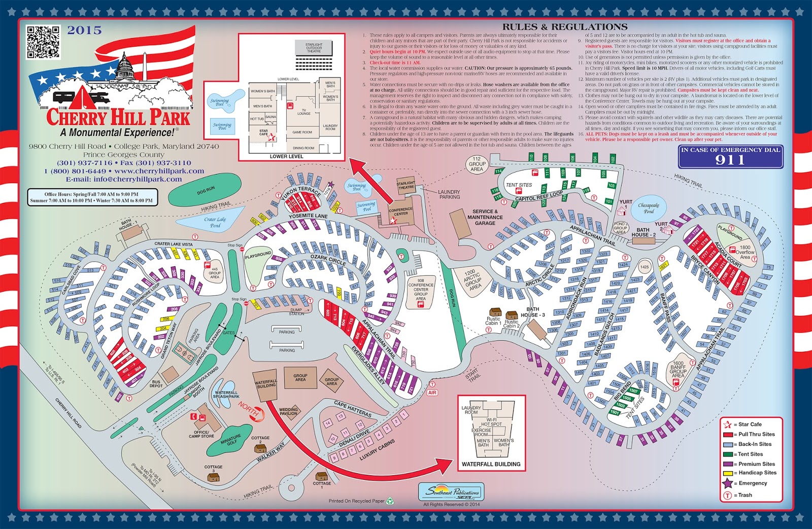 We have had a nice stay here at the Cherry Hill RV Park. There are lots of amenities. There is a lady who lives close to the park and comes in and will walk your dog while you are off for the day seeing the sites. This is a nice option to have when you leave on the bus and don't return for eleven hours. Two pools, a ballroom, large office and store, waterfall pond area, miniature golf, the Star Cafe and a staff that seems to be interested in making your stay as monumental as possible. I highly recommend the park and it is pretty close to everything you might want to see around the D.C. area.